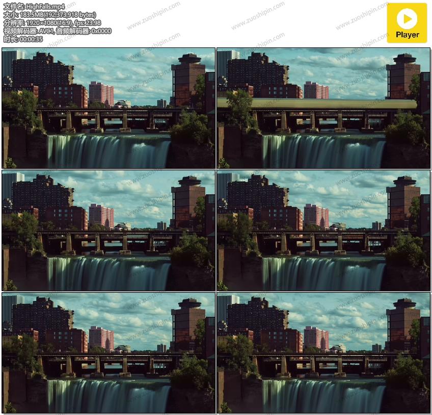High falls time lapse stock video throughout a day capturing a beautiful city scape and all its motion and movement. The water falls in this time lapse stock video flow under fast moving cars and trains.