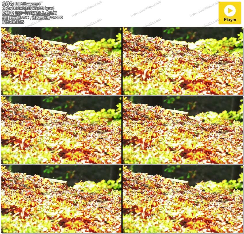 High definition fall pathway stock video of a quiet scene in autumn. Colorful changing leaves cover the ground in this fall pathway stock video. Maybe you can use it in your next seasonal project.