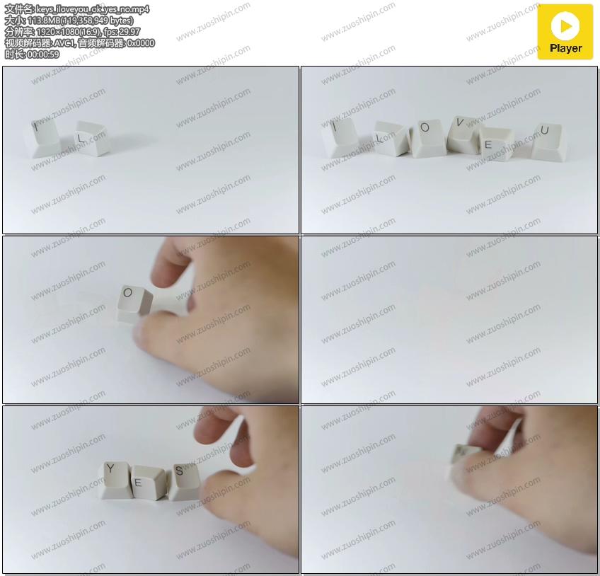 追功网为大家提供高清实拍视频素材视觉创意系列素材:键盘键帽iloveyou-ok-yes-no按键视频素材在线预览以及高清源文件的下载服务。钥匙iloveyou-ok-yes-no