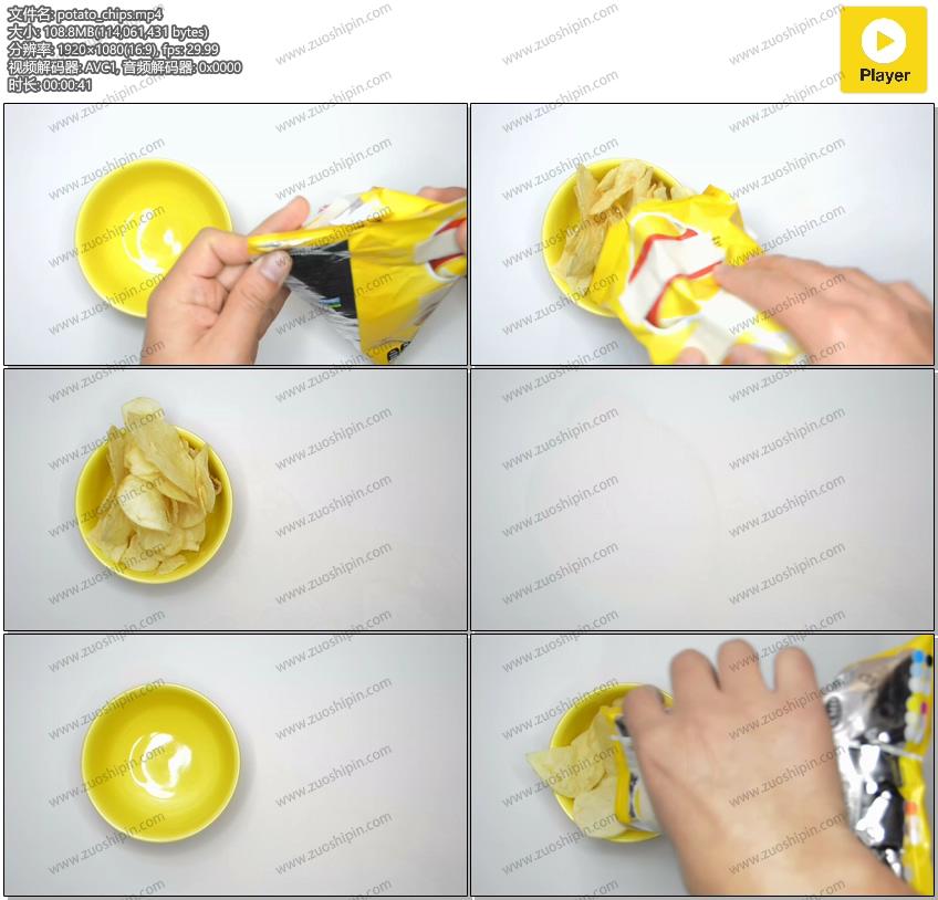 Clip of a person placing potato chips on a little bowl, for your snack projects or food topics in your footage.
