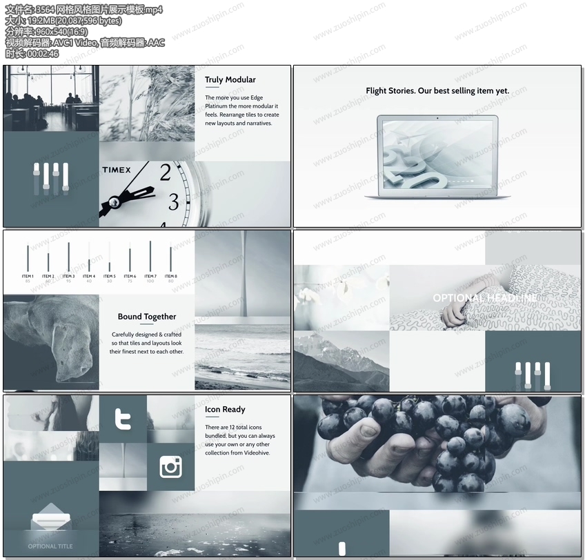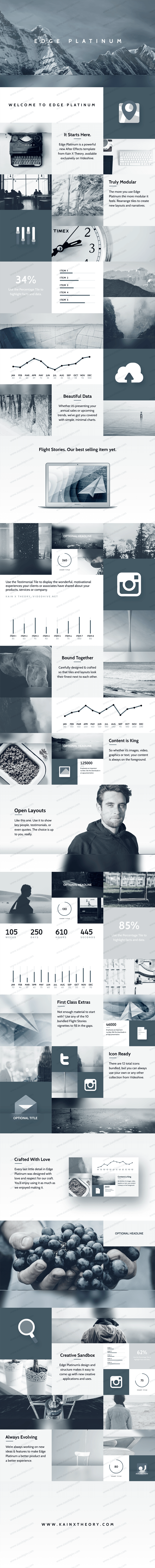 Edge Platinum is a powerful new After Effects template, designed and animated by Kain X Theory. The first in a series of grid-based presentations, it uses a grid framework to showcase images, video and any other piece of information in a smooth, elegant and professional manner. Also included are 10 vignettes made with Flight Stories and a selection of icons from Techno.