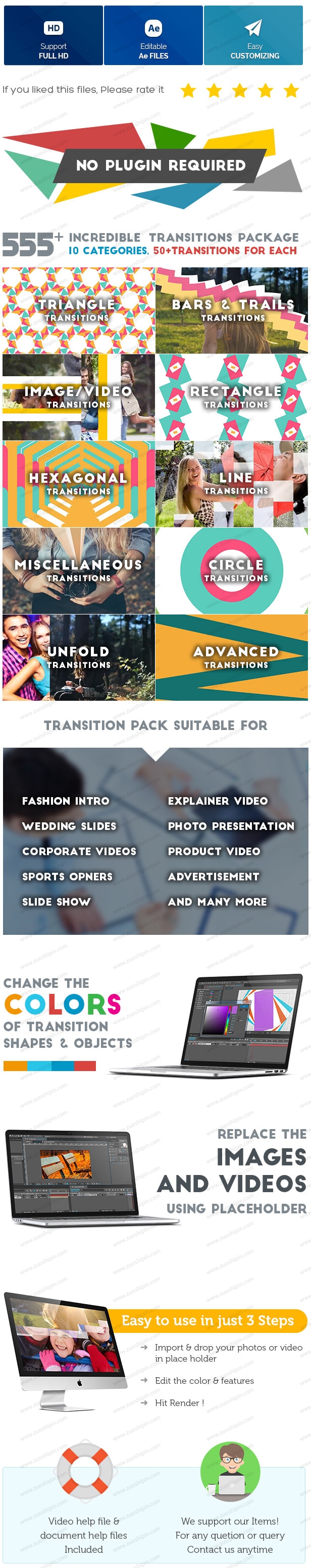 This power packed transitions template consists of 5 transition categories and each transition category has more 50+ transitions. So whether you are making a new product promo, business template or going to give a presentation, you can easily use this transitions package to add that zip to your project. We will be adding to this package and coming up with more categories in coming months. You can leave a comment on which transition categories you would like to see added to this transitions template.