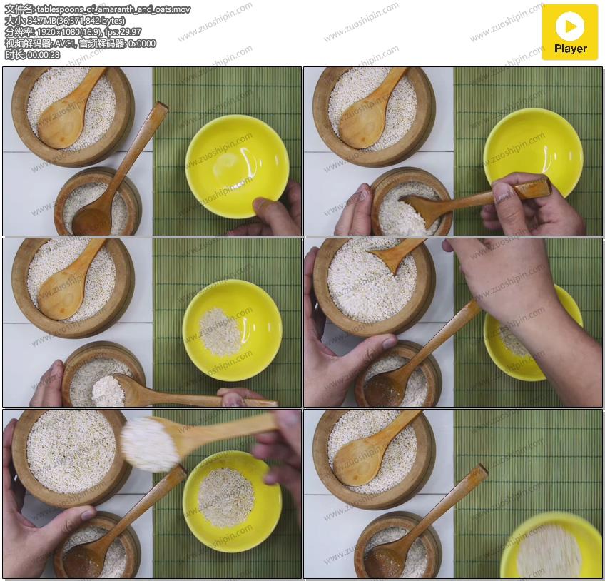 Person adding amaranth and oats in a wooden bowl with a spoon for your cuisine projects or nutrition topics in your footage.