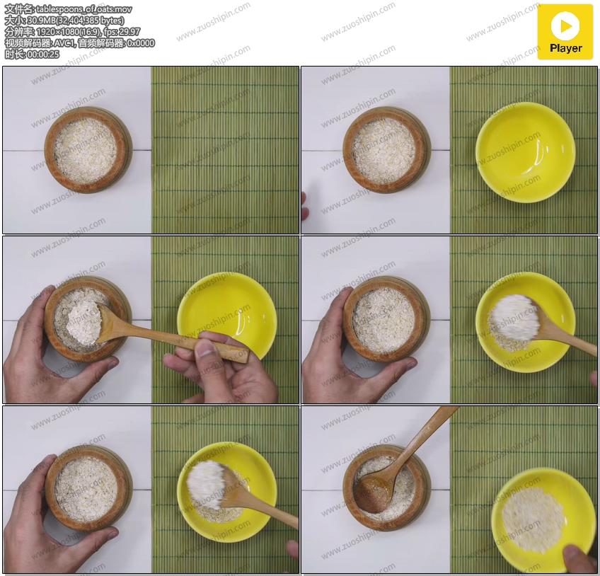 Person adding oats in a wooden bowl with a spoon for your cuisine projects or nutrition topics in your footage.