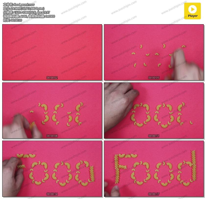 追功网为大家提供高清实拍视频素材水果食物系列素材:使用空心面食物摆放food word视频素材在线预览以及高清源文件的下载服务。