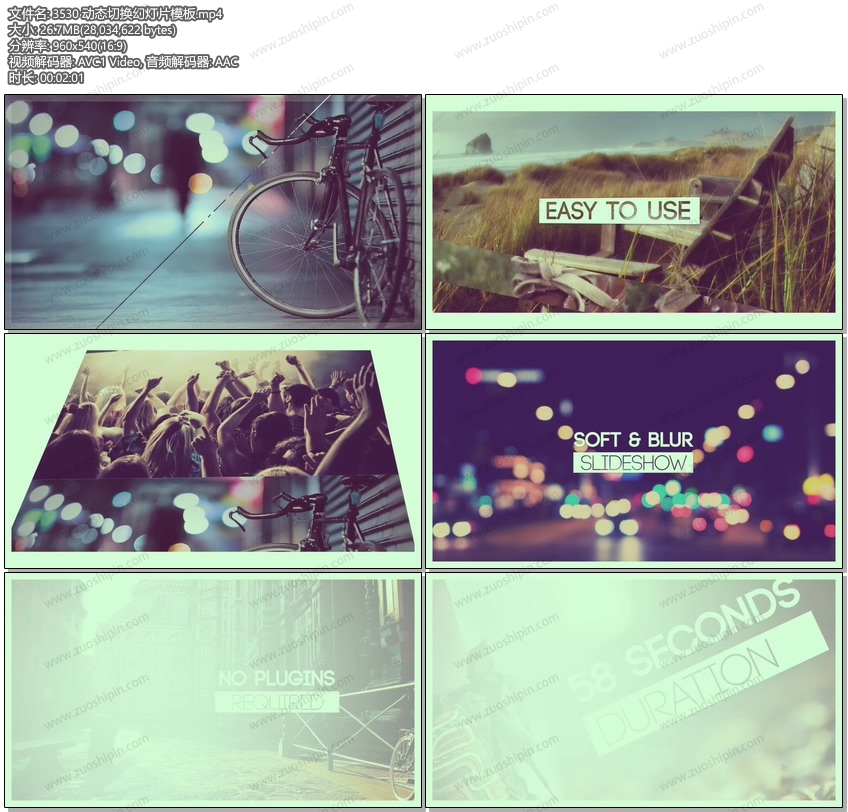关键词:模糊,干净,动态,快速,假期,简介,最小,现代,照片,短,简单,幻灯片,标题,旅游blur, clean, dynamic, fast, holidays, intro, minimal, modern, opener, photo, short, simple, slideshow, titles, travel