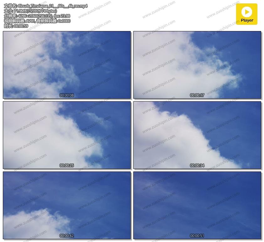 云彩和天空室外夹子。延时摄影的清晰积云从左到右缓慢移动。适合您的天气项目或您的镜头中的自由和天堂主题。 4K 4096 x 2160 | 24 fps