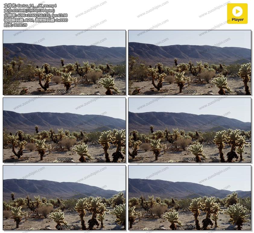 仙人掌夹子在沙漠风景的。平移拍摄在山区景观的右边与沙漠中的多刺植物。适合您的自然项目或镜头中的沙漠植物学主题。 4K 4096 x 2160 | 24 fps