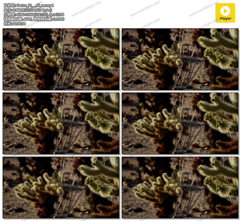 仙人掌夹子在沙漠风景的。静态拍摄聚焦几个平面的景观与多刺的植物在沙漠中。适合您的自然项目或镜头中的沙漠植物学主题。 4K 4096 x 2160 | 24 fps
