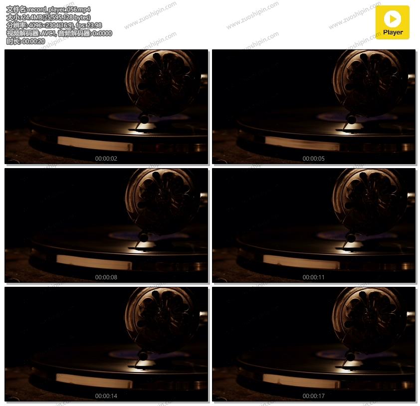 关闭古色古香的音乐设备拍摄。黑暗的极端关闭播放在经典电唱机和弱的顶上的照明设备的装饰的针黑胶唱片圆盘。非常适合您的音乐项目或您的镜头中的复古主题。 4K 4096 x 2304 | 24 fps