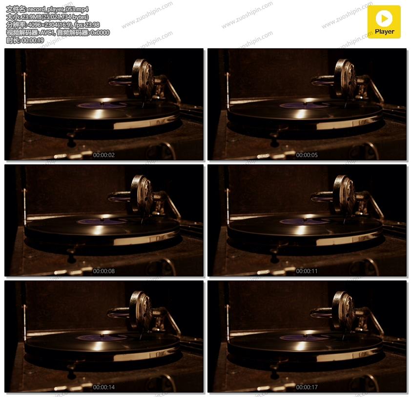 关闭古色古香的音乐设备拍摄。极端接近播放与软的顶上的照明设备的针黑胶唱片圆盘。非常适合您的音乐项目或您的镜头中的复古主题。 4K 4096 x 2304 | 24 fps