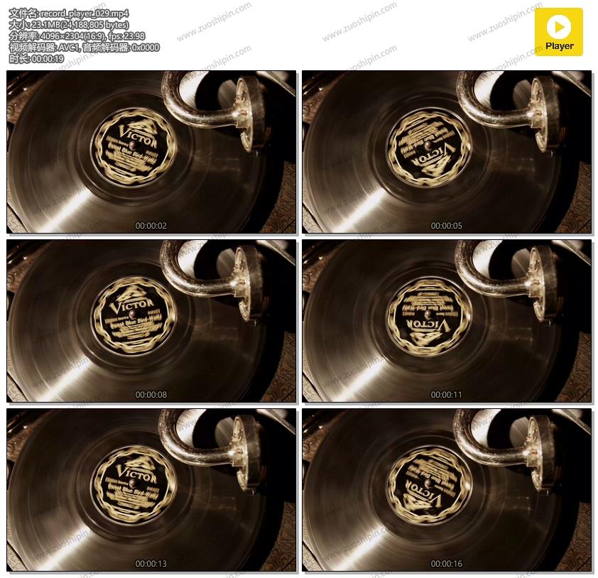 Close up shot of antique music device. Medium static shot top view of classic music device playing an old disc spinning on turntable. Ideal for your musical projects or vintage topics in your footage. 4K 4096 x 2304 | 24 fps