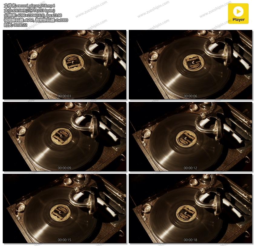 Close up shot of antique music device. Medium panning shot top view from left to right of classic record player with vinyl disc spinning on turntable. Ideal for your musical projects or vintage topics in your footage. 4K 4096 x 2304 | 24 fps