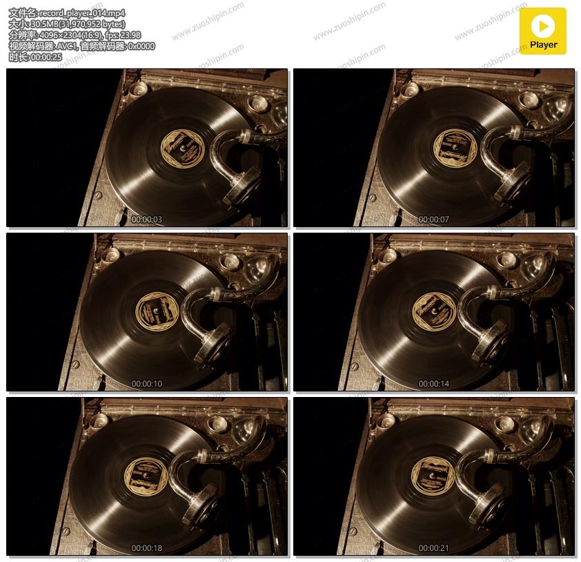 Close up shot of antique music device. Medium panning shot top view of classic music device playing an old vynil disc. Ideal for your musical projects or vintage topics in your footage. 4K 4096 x 2304 | 24 fps