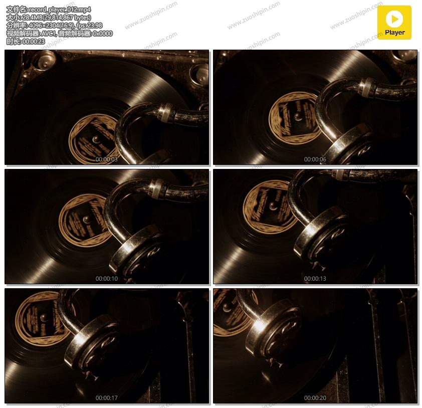 Close up shot of antique music device. Diagonal traveling shot top view of needle and antique vinyl disc spinning, from left to right in 4K. Ideal for your musical projects or vintage topics in your footage. 4K 4096 x 2304 | 24 fps
