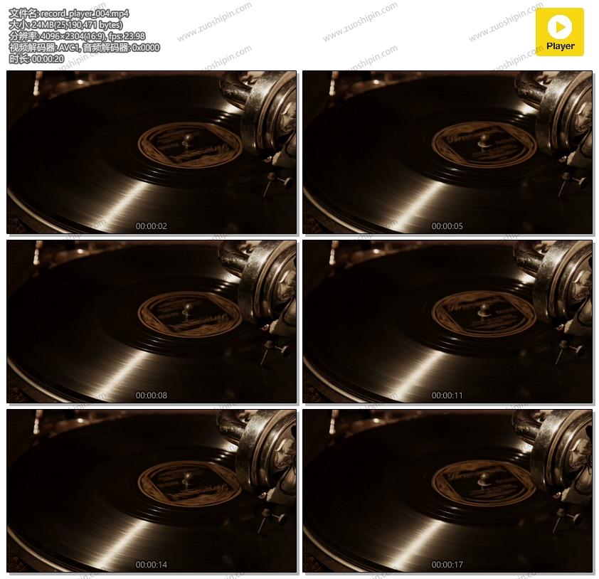 Close up shot of antique music device. Extreme close up shot of old record player, turntable with vynil disc and needle in 4K. Ideal for your musical projects or vintage topics in your footage. 4K 4096 x 2304 | 24 fps