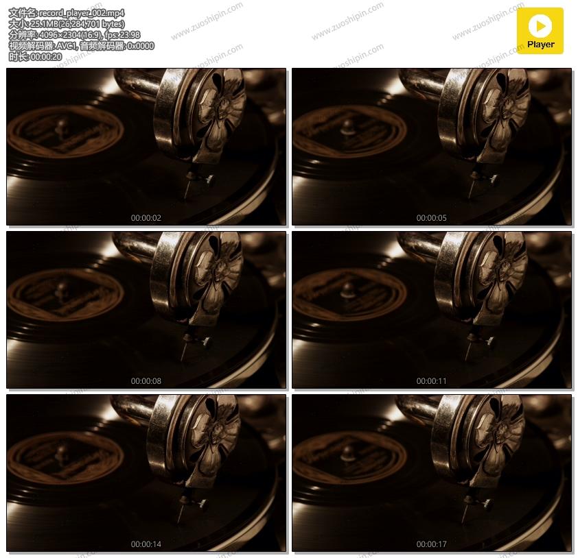 Close up shot of antique music device. Close up shot of old record player, turntable with vynil disc and reproducer needle. Ideal for your musical projects or vintage topics in your footage. 4K 4096 x 2304 | 24 fps