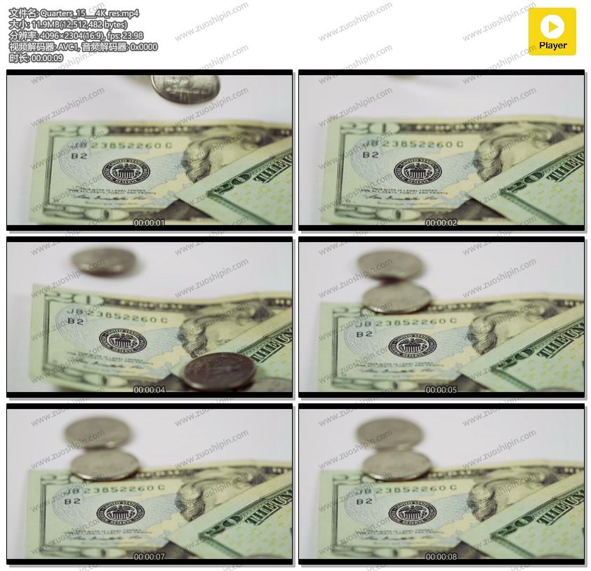 Close up shot of american money. 四分之一美元的很多硬币落在白色桌上的两张20美元的钞票,最后两个硬币和两个票据在4K的场景安置了A lot of coins of quarter dollar falling over two $20 bills on white table, finally two coins and both bills placed in the scene in 4K
