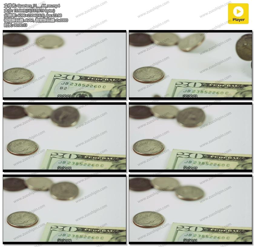 很多硬币的四分之一美元下降和旋转三个硬币和一张20美元的钞票在白色桌子上,最后四个硬币和票据放在4K的场景