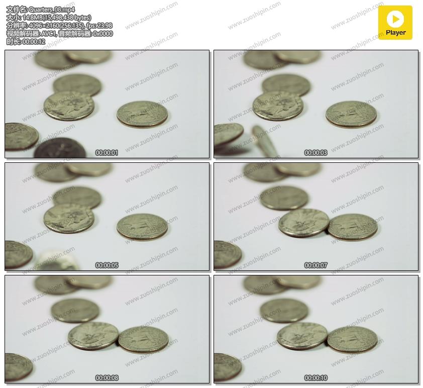 一张白色桌七枚硬币的四分之一美元硬币4K视频素材