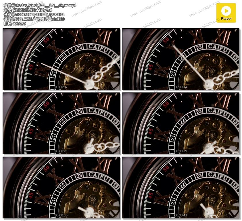 Close up shot of pocket watch. 极端接近怀表与暴露的机械工作在4K时间间隔的二十分钟. Ideal for your vintage projects or antiques topics in your footage. 4K 4096 x 2160 | 24 fps