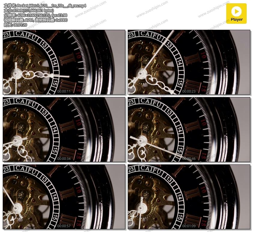 Close up shot of pocket watch. 极端特写的怀表与暴露机械工作从7点09分到7点40分在4K延时摄影. Extreme close up of pocket watch with exposed machinery working from 7:09 to 7:40 in 4K time lapse