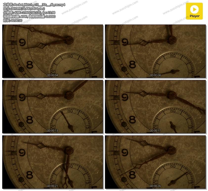 关闭怀表拍摄。 极端近距离拍摄的时钟指针从4点40分移动到9:50在4K延时摄影。 适合您的老式项目或镜头中的古董主题。 4K 4096 x 2160 | 24 fps