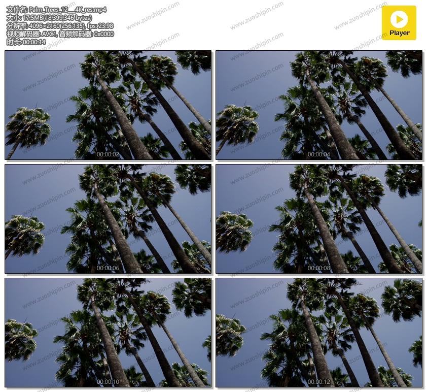 低角度拍摄了在棕榈树的明亮的蓝天背景在4K