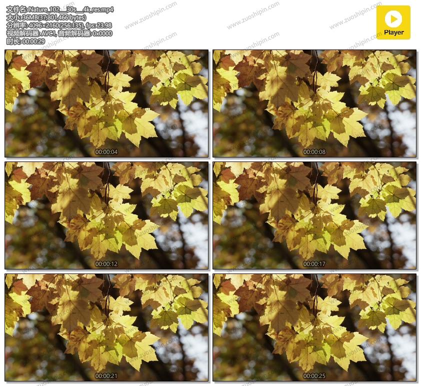 室外拍摄植物和树。呈杂色的叶子的黄色安排在defocused森林背景的。适合您的植物学项目或您的素材中的自然主题。 4K 4096 x 2160 | 24 fps