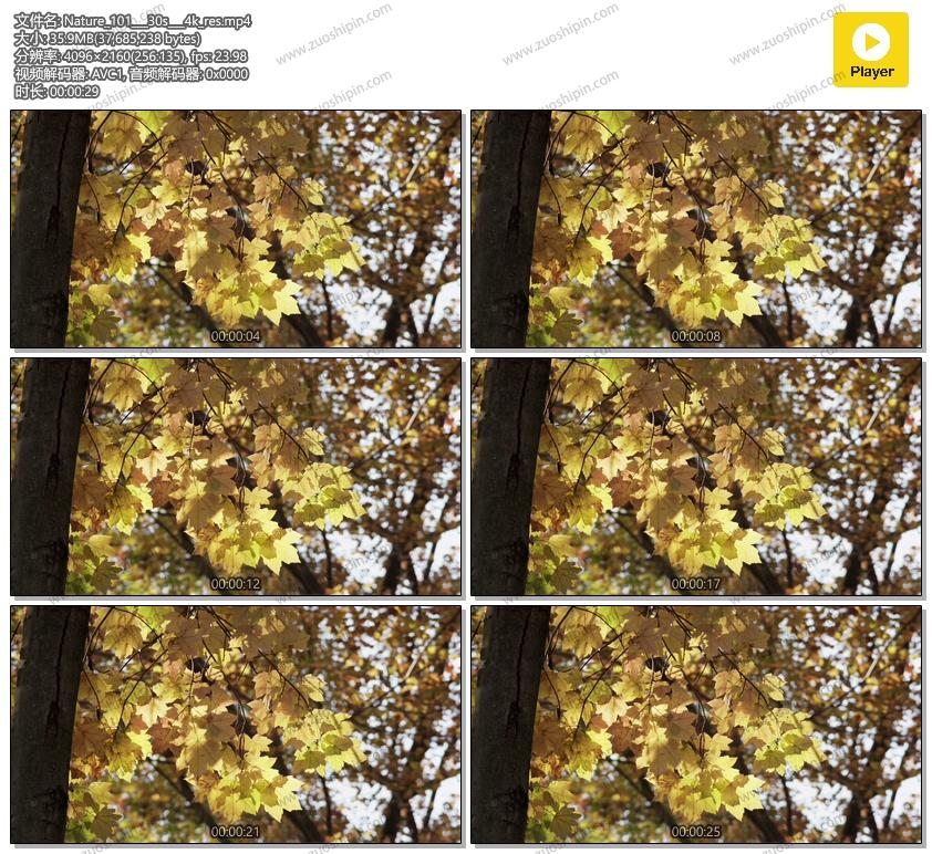 室外拍摄植物和树。慢慢地移动在森林背景的明亮的金黄叶子适合您的植物学项目或您的素材中的自然主题。 4K 4096 x 2160 | 24 fps