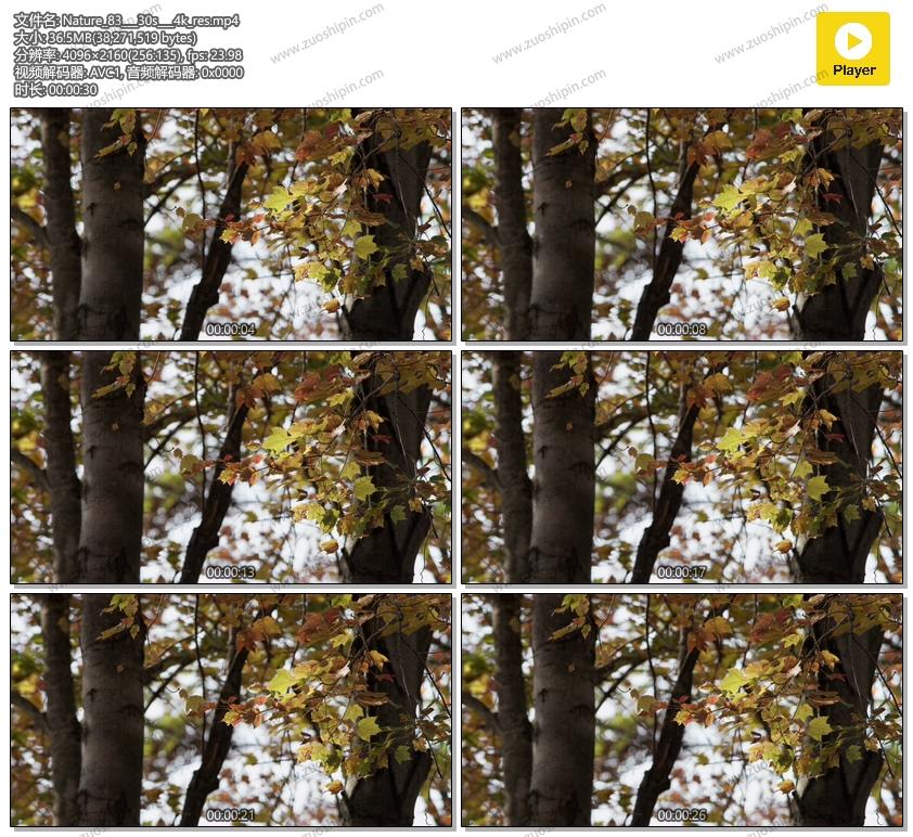 室外拍摄植物和树。斑驳的黄色和红色叶子在树枝上放松运动。适合您的植物学项目或您的素材中的自然主题。 4K 4096 x 2160 | 24 fps