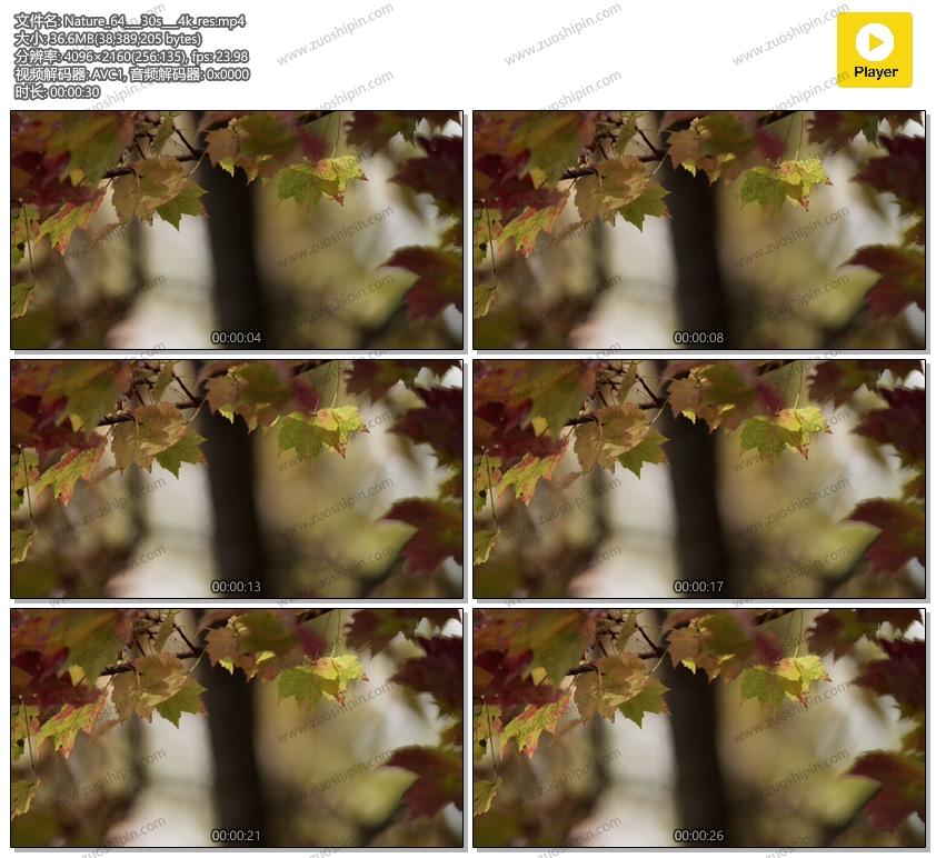 室外拍摄植物和树。在上部角落的红色和绿色呈杂色的叶子慢慢地移动与在背景中的模糊的树干。适合您的植物学项目或您的素材中的自然主题。 4K 4096 x 2160 | 24 fps