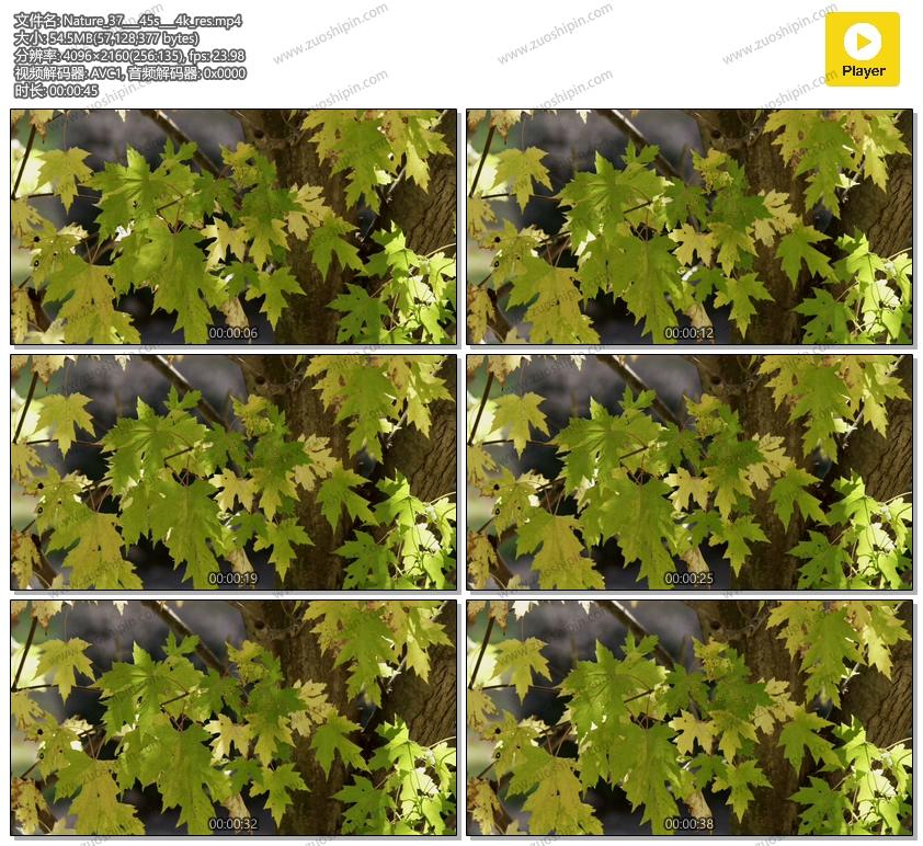 室外拍摄植物和树。叶子黄色和绿色纹理有与树干的棕色defocused背景。适合您的植物学项目或您的素材中的自然主题。 4K 4096 x 2160 | 24 fps