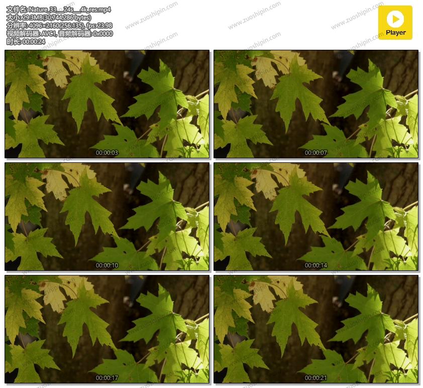 室外拍摄植物和树。在前景的绿色叶子在焦点叶子的风移动了在backgund。适合您的植物学项目或您的素材中的自然主题。 4K 4096 x 2160 | 24 fps