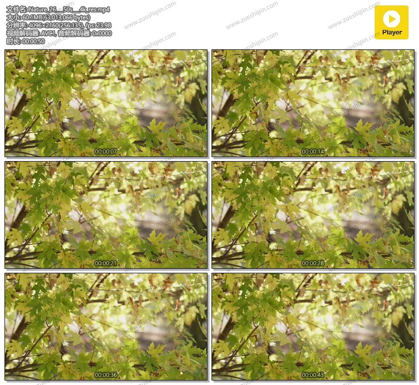 室外拍摄植物和树。与黄色和绿色叶子和木头分支的自然模板。适合您的植物学项目或您的素材中的自然主题。 4K 4096 x 2160 | 24 fps