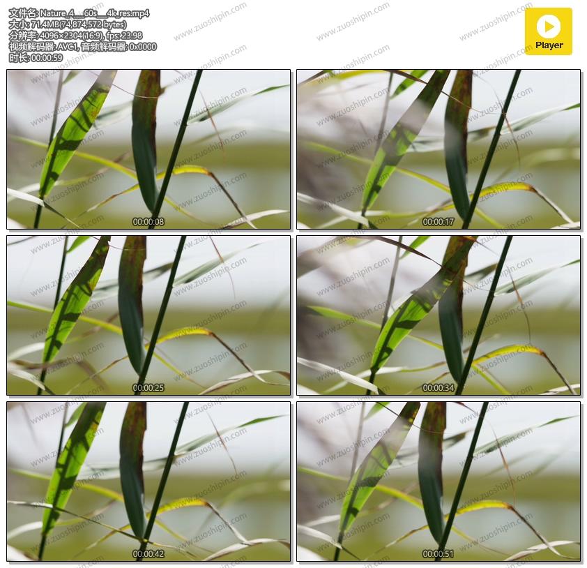 Outdoor shot of plants and trees. Close up of long green leaves moving slowly with branches in foreground. Ideal for your botany projects or nature topics in your footage. 4K 4096 x 2304 | 24 fps