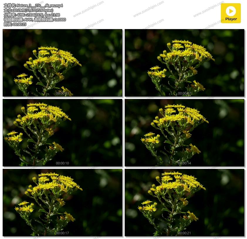 室外拍摄植物和树。关闭移动由风的小的黄色花。适合您的植物学项目或您的素材中的自然主题。 4K 4096 x 2304 | 24 fps