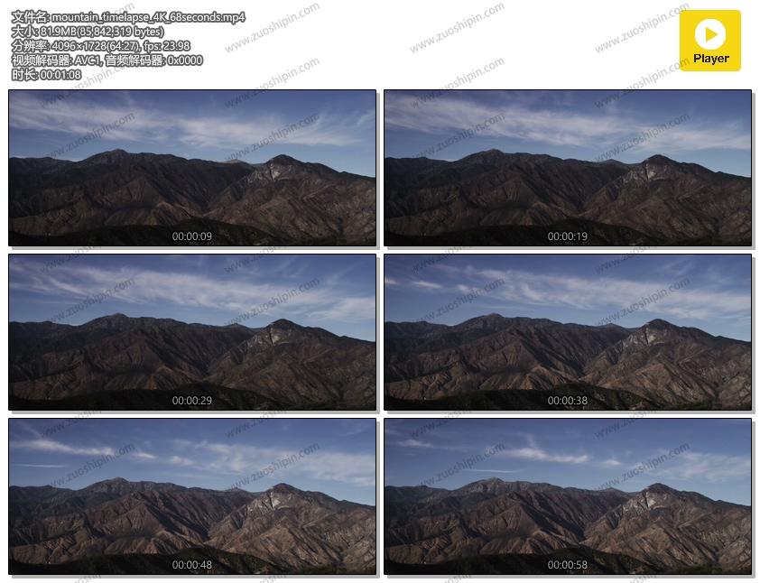 自然风景室外拍摄。山风景Timelapse与横渡天空的云彩的。适合您的旅行项目或您的镜头中的度假主题。 4K 4096 x 1728 | 24 fps