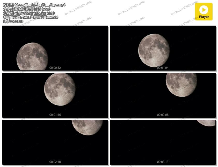 夜间室外拍摄的月亮。关闭穿过场面的明亮的月亮从左到右在dakness。适合您的天文项目或您的镜头中的万圣节主题。 4K 4096 x 1728 | 24 fps