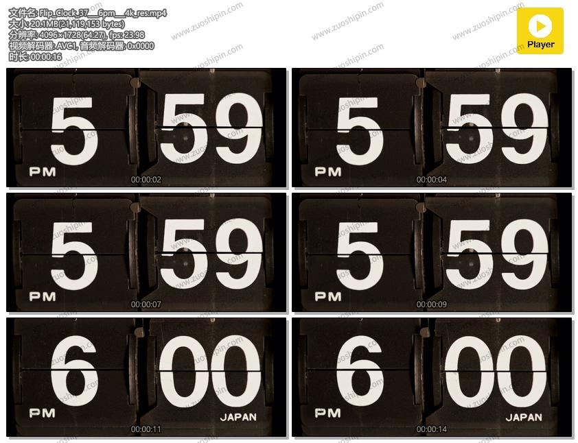 关闭时钟数字拍摄。复古翻盖时钟从下午05:59改为下午06:00。非常适合您的生产力项目或素材中的时间主题。 4K 4096 x 1728 | 24 fps