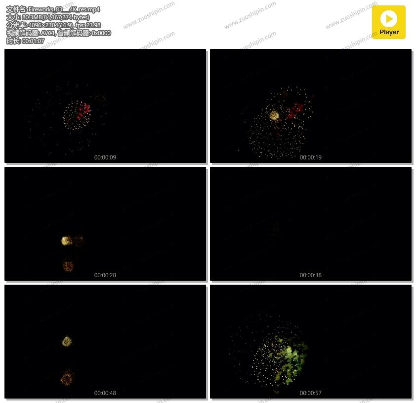 夜间的壮观烟花片段。爆炸在夜场面的一点金黄闪烁烟花和大牡丹。适合您的周年纪念项目或您的镜头中的庆祝主题。 4K 4096 x 2304 | 24 fps