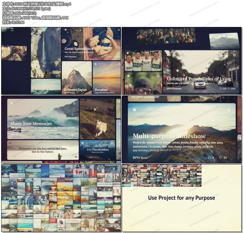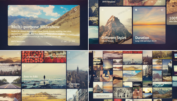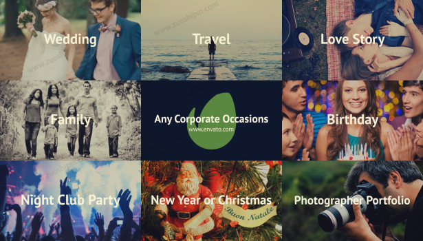 No matter who you are this template will help you to make a video for almost every theme: travel, family, friends, wedding, love story, anniversary, Christmas, club parties, New Year, Easter, birthday, photo portfolio, any holidays or any corporate events, etc.