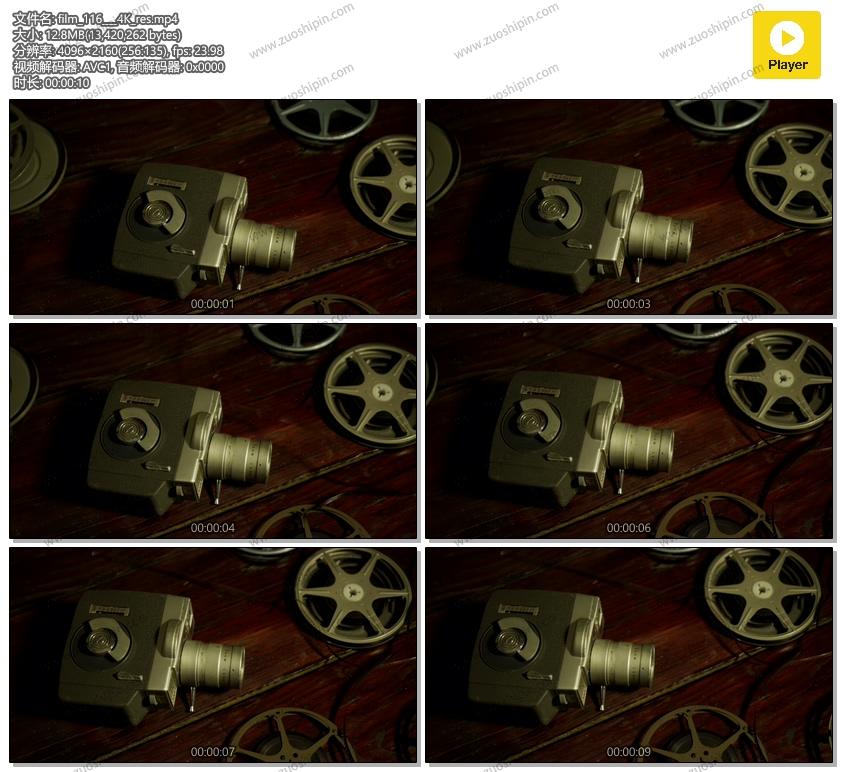 经典投影仪和摄影项目的剪辑。短片平移拍摄的电影飞行,五个卷轴和一台古老的相机在桌子上。非常适合您的摄影项目或素材中的复古主题。 4K 4096 x 2304 | 24 fps