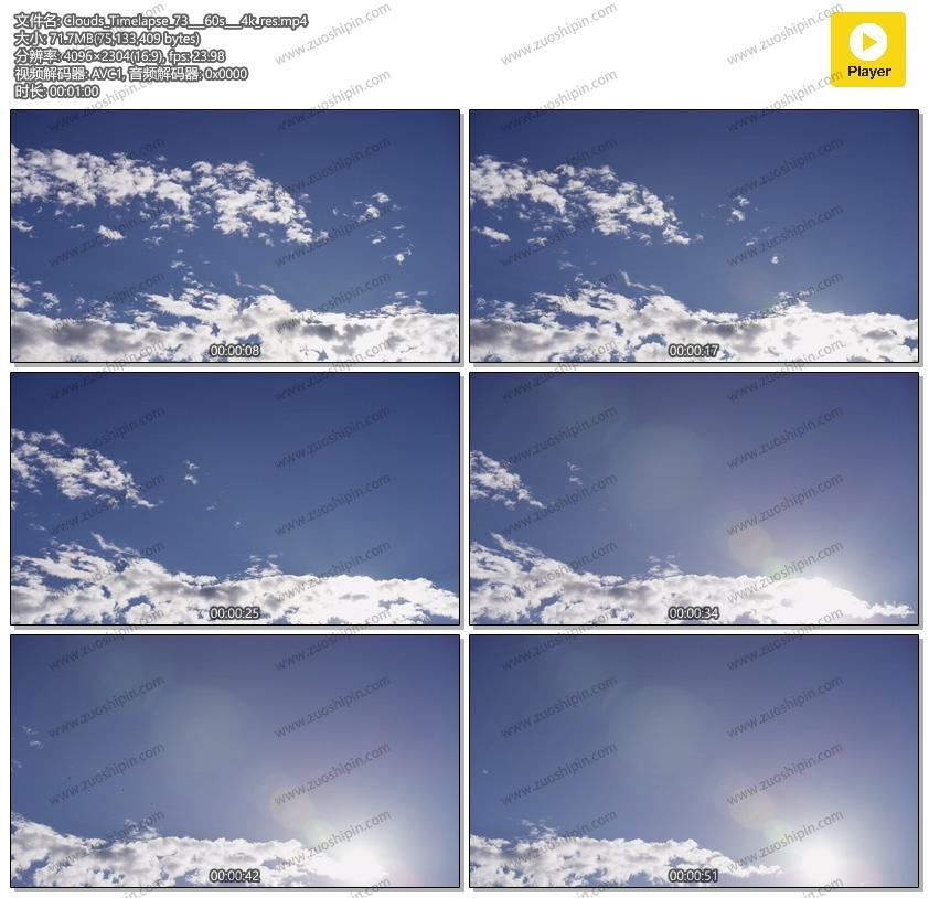 云彩和天空室外夹子。高积云时间间隔在蓝天与火光和太阳慢慢地移动。适合您的天气项目或您的镜头中的自由和天堂主题。 4K 4096 x 2304 | 24 fps