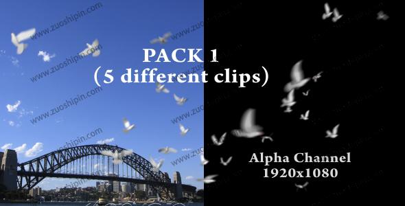这是一群飞过屏幕的鸽子。 5个不同的剪辑,alpha,30fps,1920×1080。