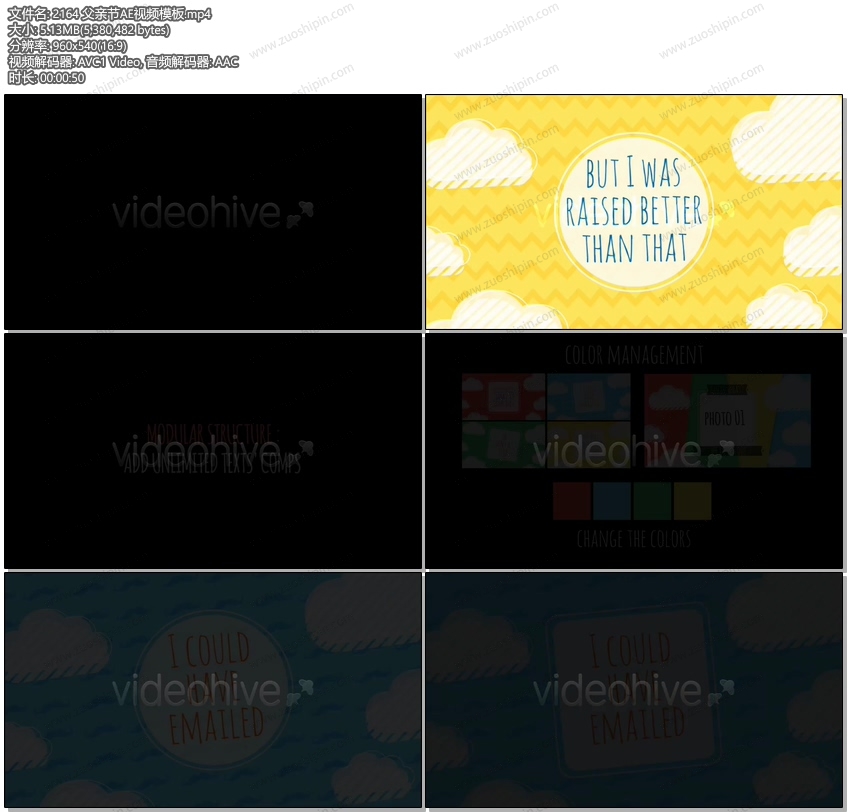 This template is made with After Effects CS4 and has 5 placeholders for your texts, and one for your logo o photo. It doesn’t require any kind of third-party plugins and it’s totally user friendly: you can easily change bg colors with colors’ control. Moreover it has a modular structure, so you can add unlimited texts’ comps.