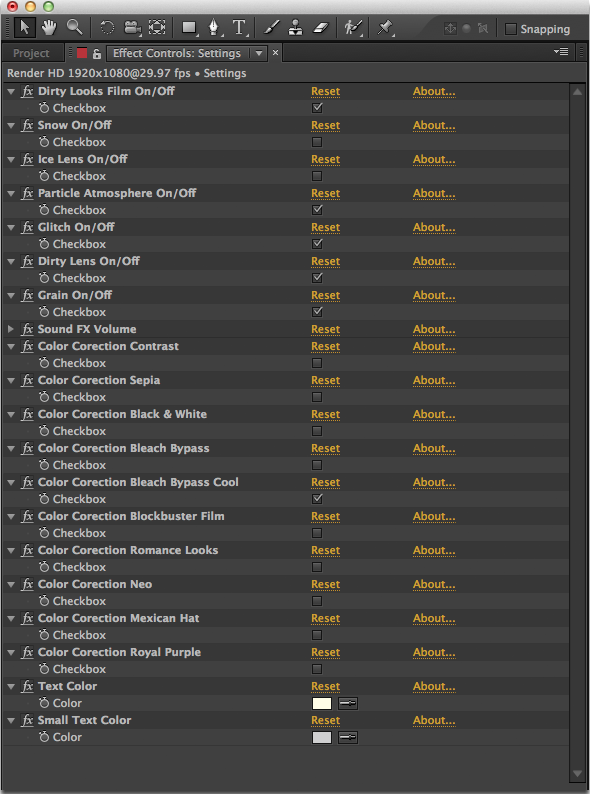 - 10 Color Corrections in project: Sepia, Black & White, Bleach Bypass, Blockbuster Film, Romance Looks, Green Neo, Mexican Hat, Royal Purple.