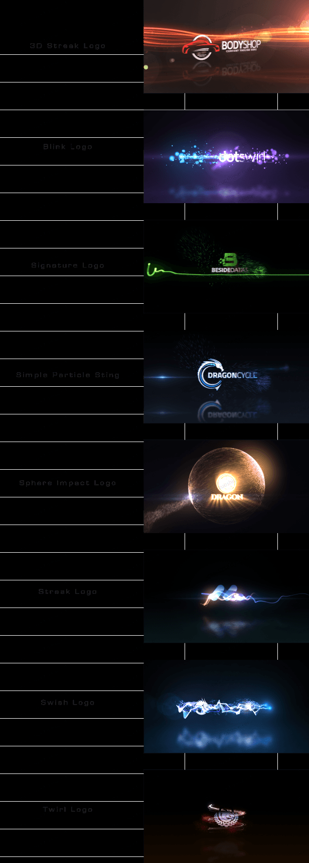 The 8 projects are all well structured and easy to customize. Every example of the preview is made with a few clicks! All basic customization options like colors, flare brightness, positions, are easily accessable within
