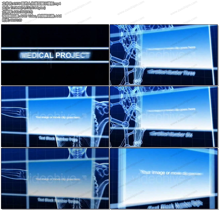 The project features biology and anatomy images – human forms, skeletons, DNA, syringes and x-ray imagery. Great for pharmaceutical or science use, but the project is generic enough for many different uses.