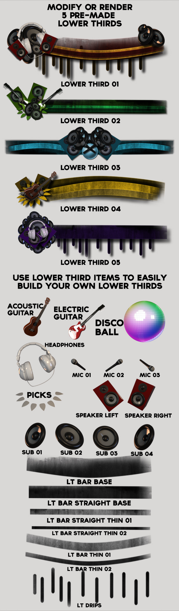 Music Lower Thirds Is 25 pre-rendered elements including 3d musical items to create great looking motion graphic lower thirds. Use the elements provided, or combine them with your own. Check out the items included below.